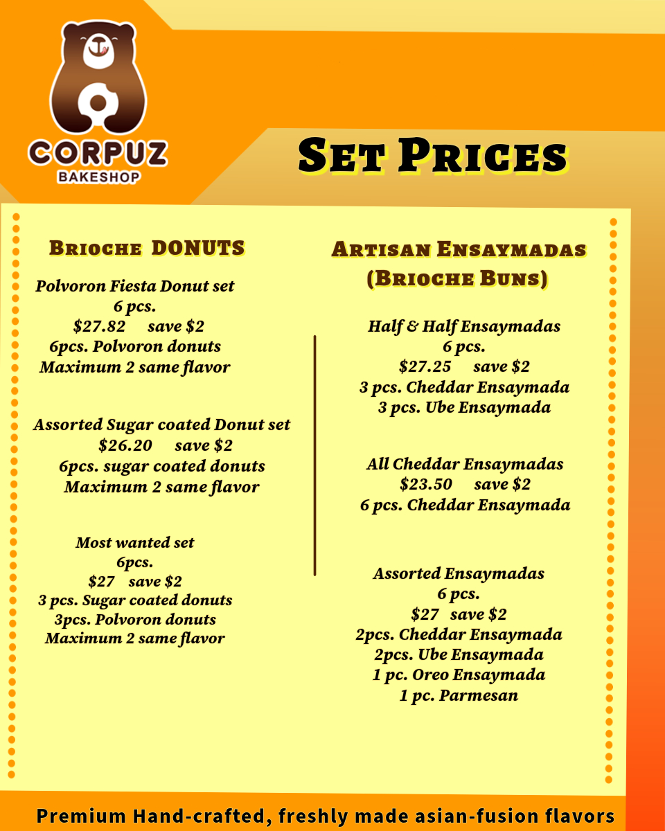 Welcome to Corpuz Bakeshop, located on Alberta Ave in Edmonton, where the heart of Filipino flavors meets artisanal baking. Their menu showcases an impressive selection of gourmet donuts, each priced at CA$4.85, featuring unique flavors like Thai Pandan Kaya, King Durian, and Tiramisu. The artisan ensaymadas offer a delightful twist, with options like Ube and Oreo ensaymada, drawing in fans with prices ranging from CA$4.25 to CA$5.50.